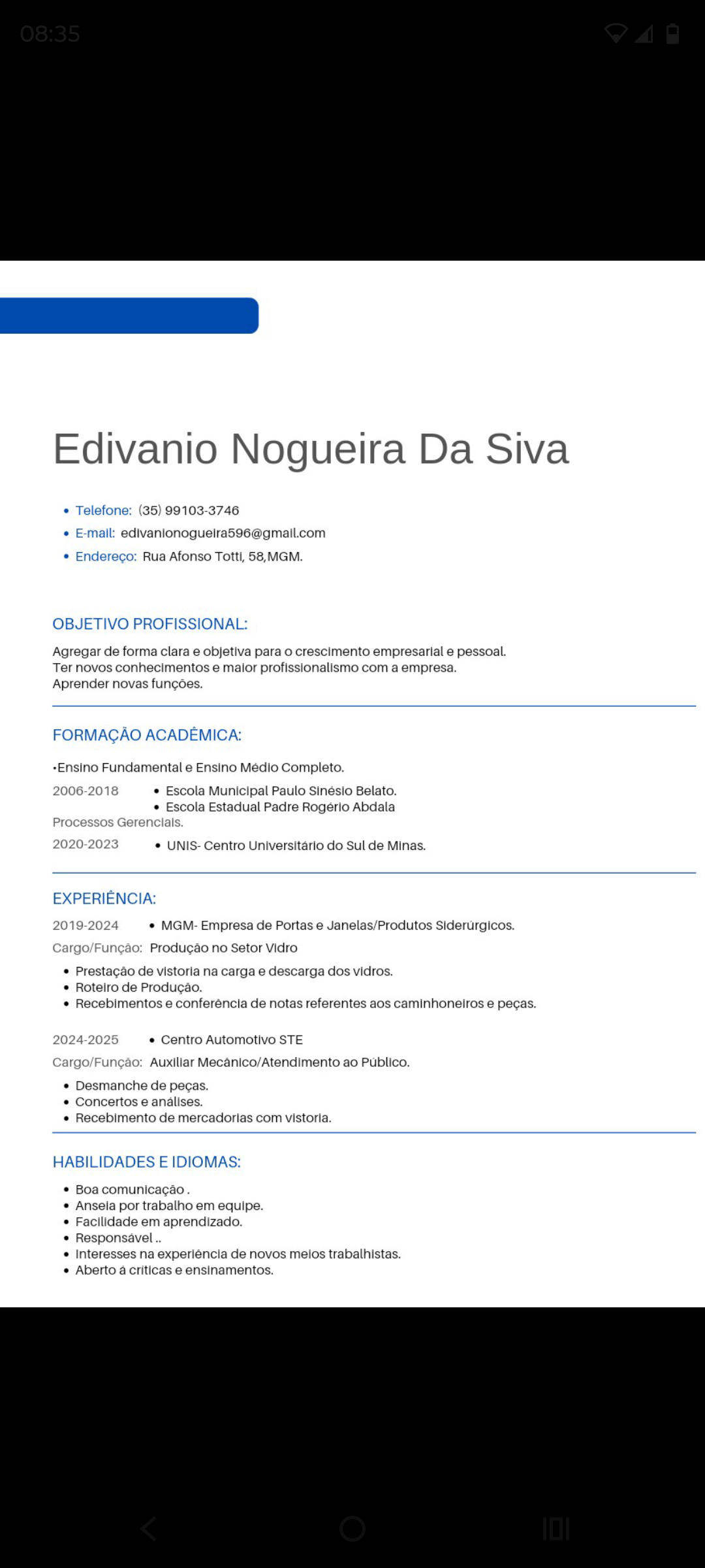 Resumo Profissional: Trabalhei na empresa MGM no período de 2 anos como alimentador de linha, Trabalhei como porteiro no período de 1 ano, tenho experiência com pintura residencial.