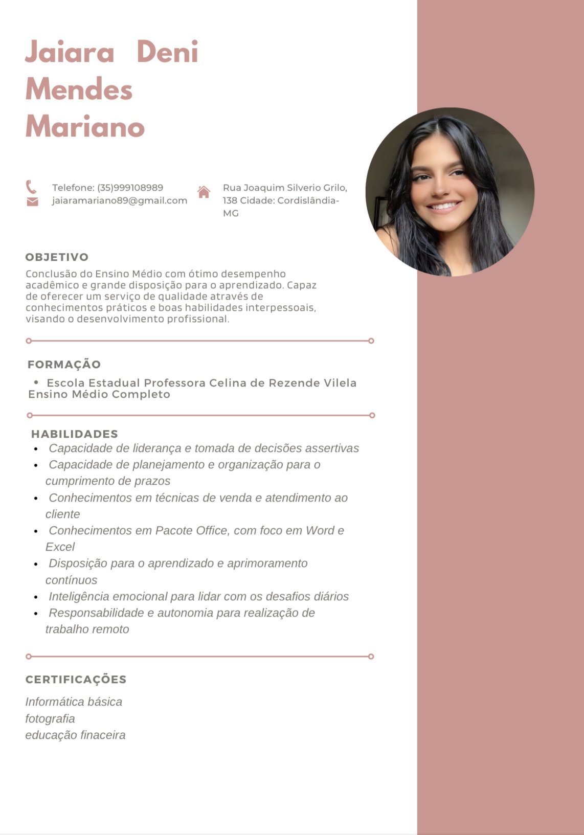 Resumo Profissional: Auxiliar de produção na empresa Sobral Invicta em Pouso Alegre MG De agosto de 2014 até março de 2015