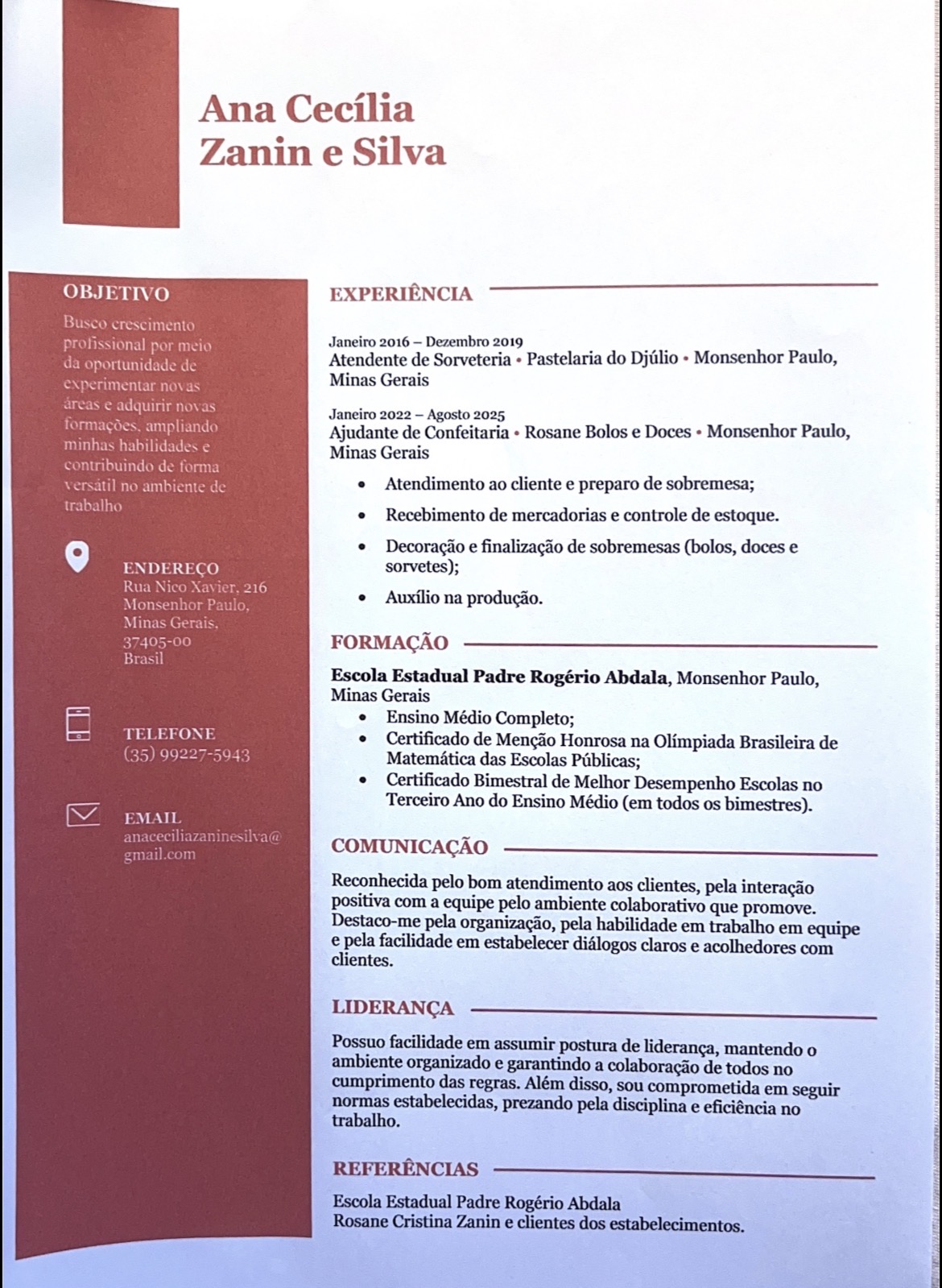 Resumo Profissional: Trabalhei por um período de 5 meses na Padaria Bom Sabor nos Serviços Gerais.