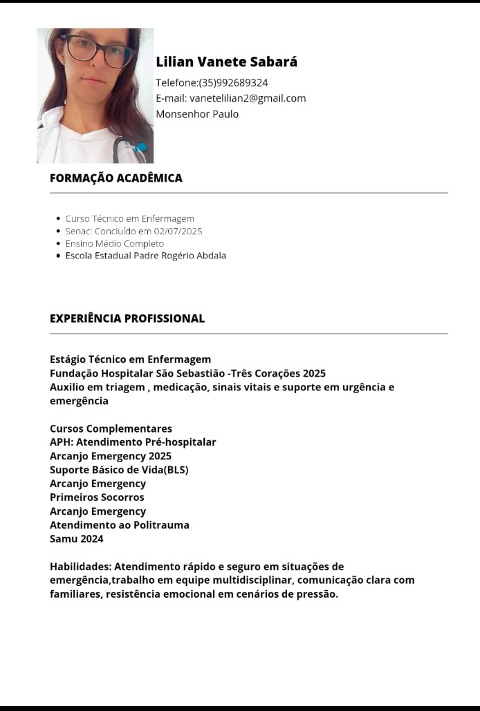 Experiência como recepcionista hospitalar e Pronto socorro. Trabalhei em secretaria escolar, Agente comunitária de saúde, Conselheira tutelar. Conhecimento e CRAS e CAPS enquanto estagiária.