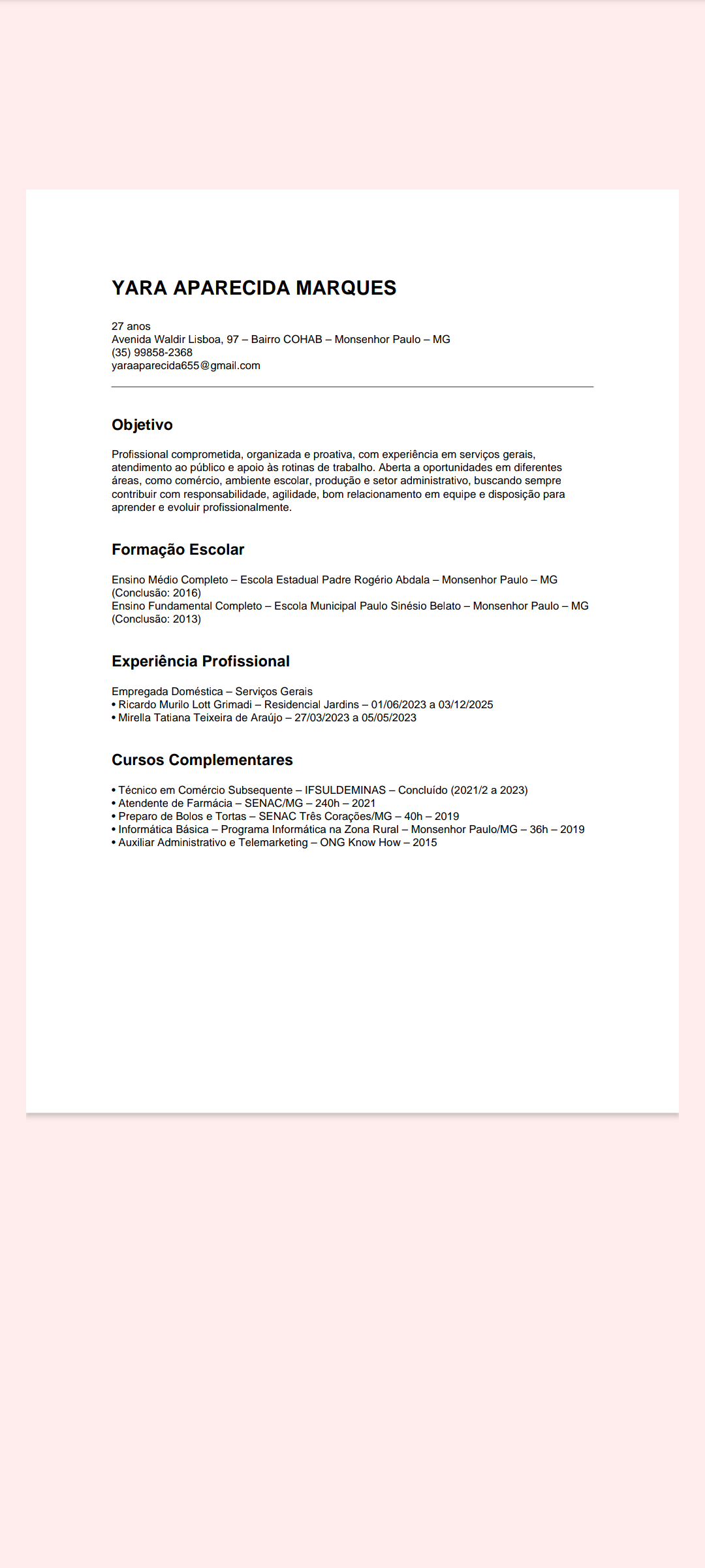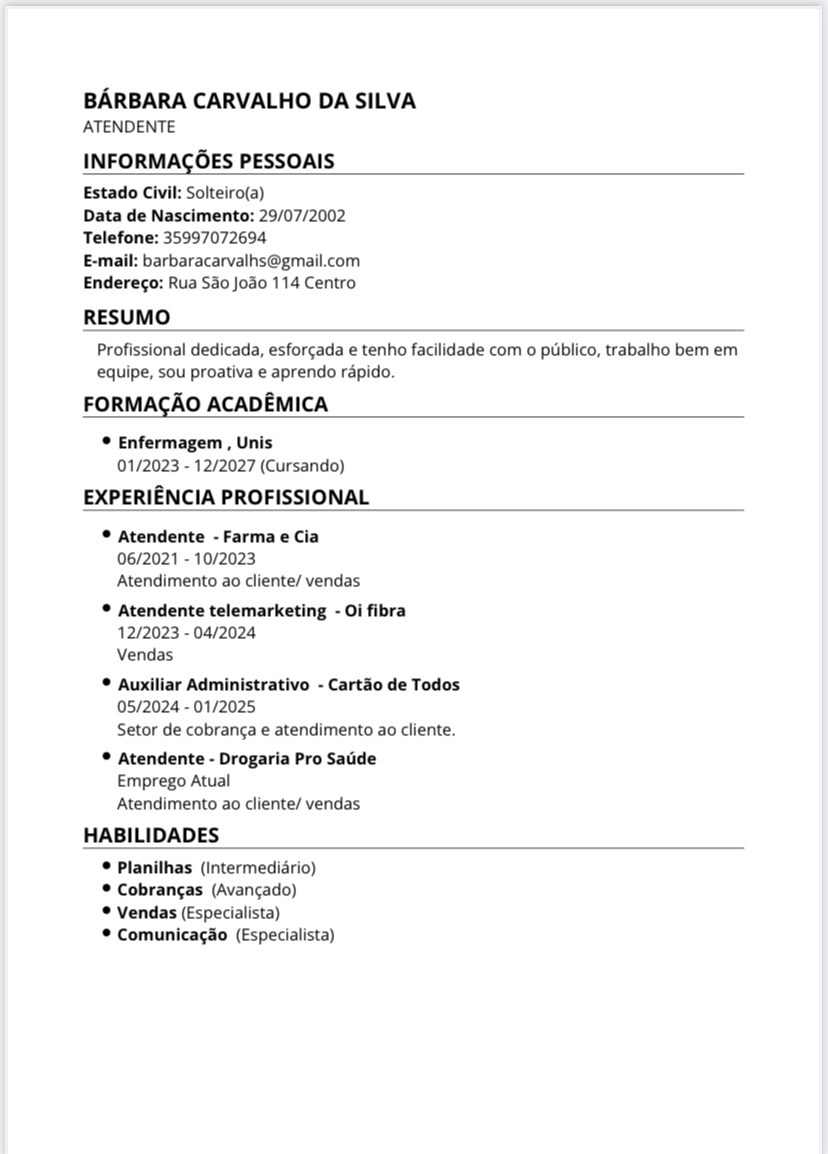 ATUOU NA MGM PRODUTOS SIDERURGICOS, DE SETEMBRO/2025 ATE FEVEREIRO/2026, LINHA DE PRODUCAO. TRABALHOU COMO BALCONISTA E BABA. ESTÁ CURSANDO PRIMEIRO PERIODO DE FARMACIA. TEM CURSO DE INFORMATICA.